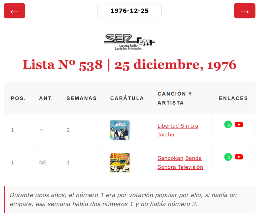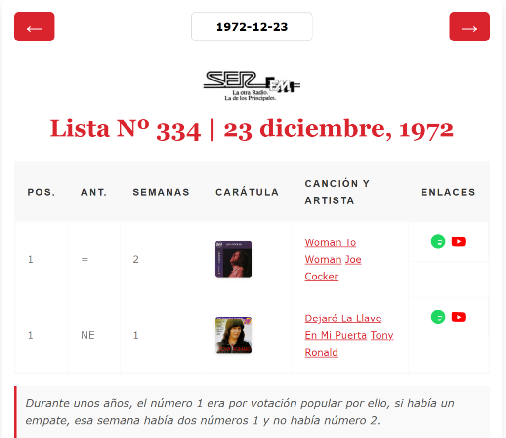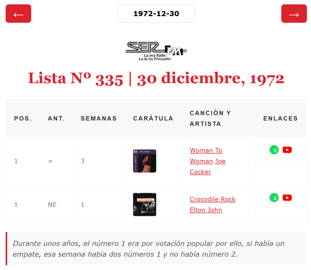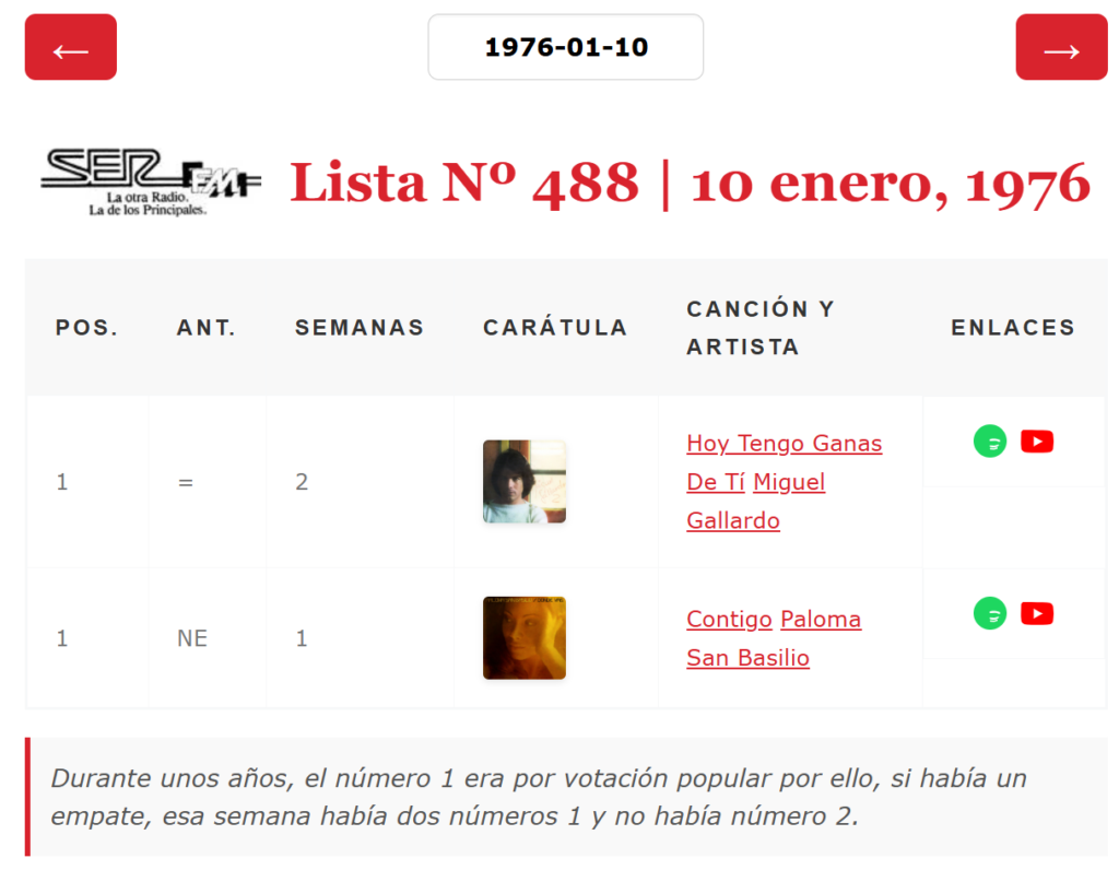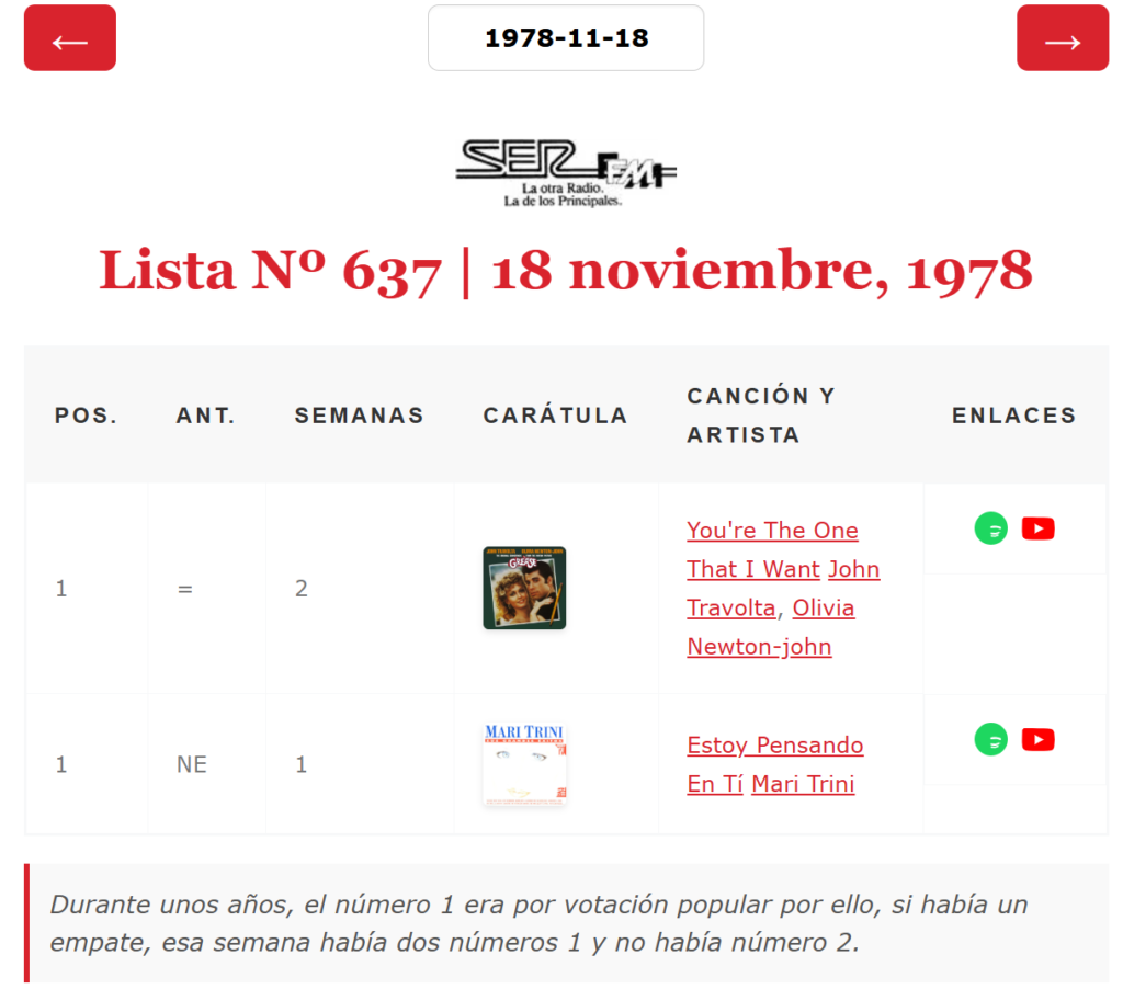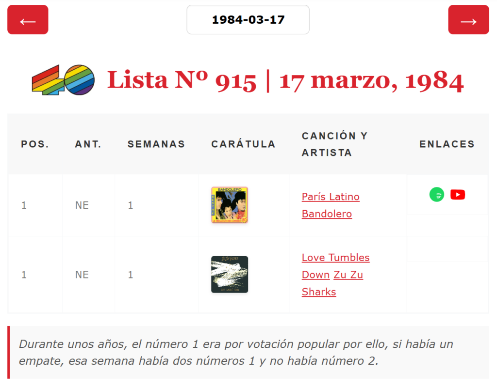 Ya hemos adaptado nuestra base de datos a esta casuística y ya puedes consultar esos dobles números 1 en nuestra base de datos. Nuevamente agradezco a quién lo descubrió y a quien lo recordó hoy porque entre todos podemos hacer más completo este rincón común de amantes de la historia de Los 40 principales. Aclarar que en las siguientes capturas la posición de la semana anterior no es correcta en la mayoría de los casos al no tener las listas completas, por el momento, de esas semanas y las anteriores.