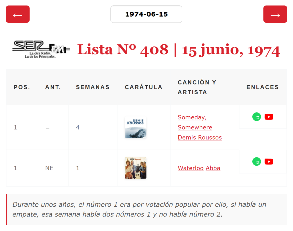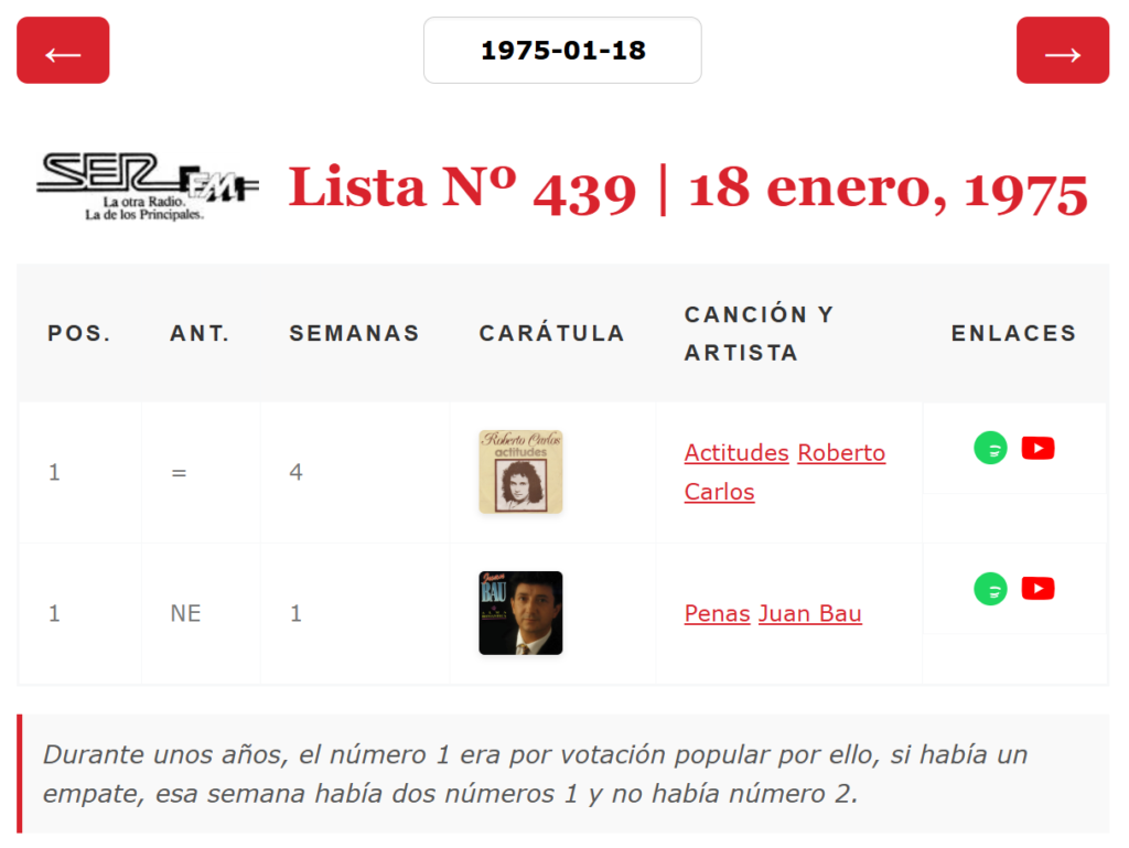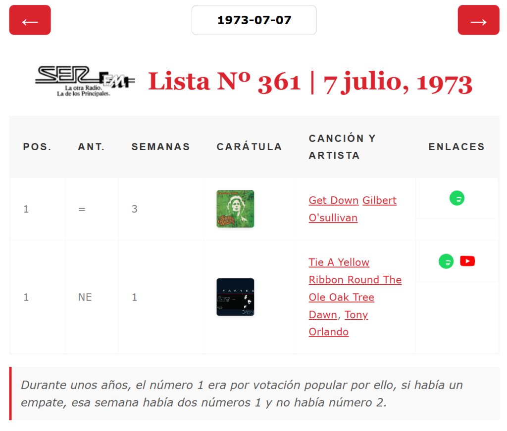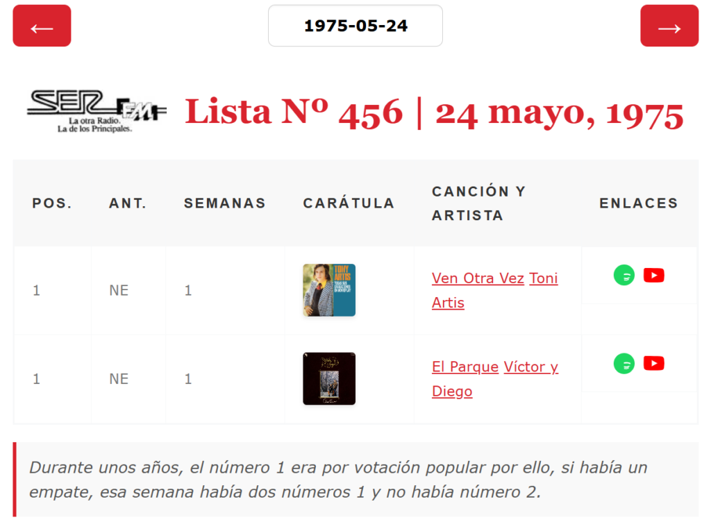 JorgeTomasTop40, alguien al que estoy profundamente agradecido porque ha sido la única persona que ha compartido sus avances en la recopilación de listas antiguas de 40, descubrió en sus investigaciones y recopilaciones de listas antiguas del Diario de Madrid, ABC o El Gran Musical, que, algunas semanas, en Los 40 Principales, había habido un doble número 1. Aquí está la entrada en su blog donde lo comentaba. Durante unos años el número 1 de la lista se eligió por verdadera votación popular y, entonces, podía ocurrir que 2 canciones acumularan el mismo número de votos con lo que esa semana había 2 números 1 en la lista y no había número 2. Esto, en principio, podría parecer un error de imprenta en la fuente, pero al consultar la lista de la semana siguiente, la posición de esas canciones en la lista de la semana anterior indica 1 para ambos temas. Es toda una rareza que hasta la propia emisora ha querido olvidar porque en el listado oficial de números 1 de la emisora esas semanas aparece un único número 1 perdiéndose en el tiempo el 2º número 1. Hoy se cumple el 42 aniversario de la última vez en la que esto ocurrió por ello el twittero @Memoria40, lo ha recordado en su TL